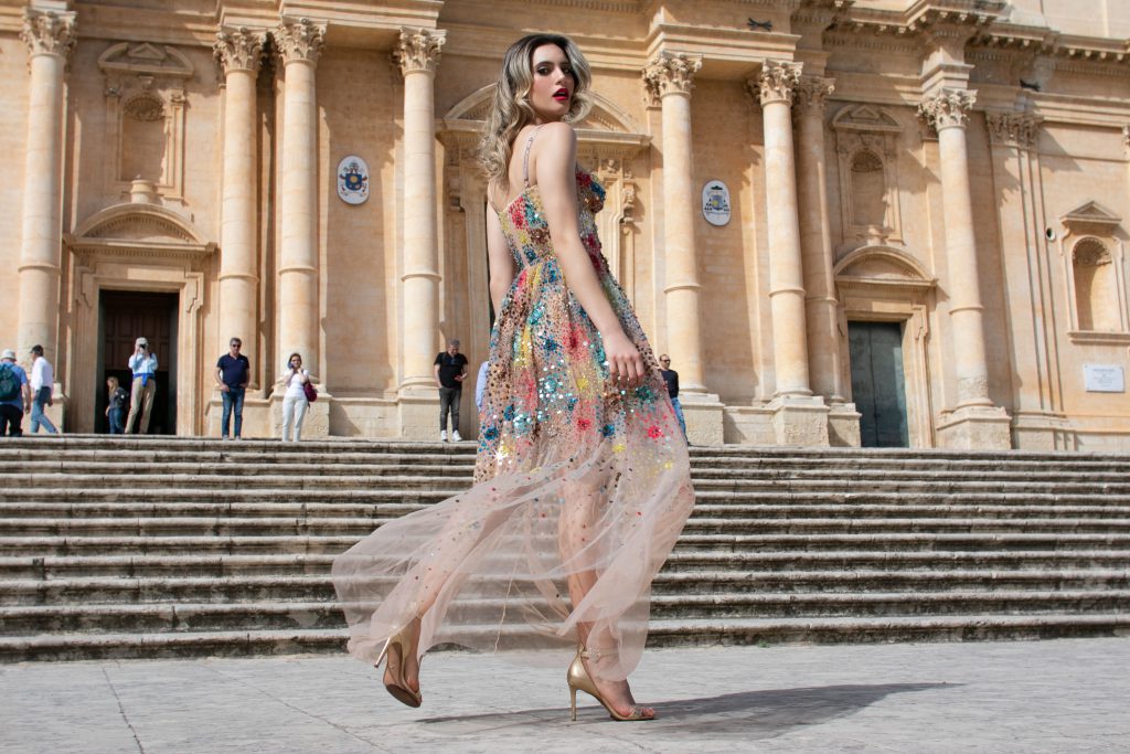 Immerse tra i colori e i profumi di Sicilia, vivono la città con outfit daily fino a sera, quando l’eleganza dei capi scelti da Martellino fa da cornice a questo splendido scenario.